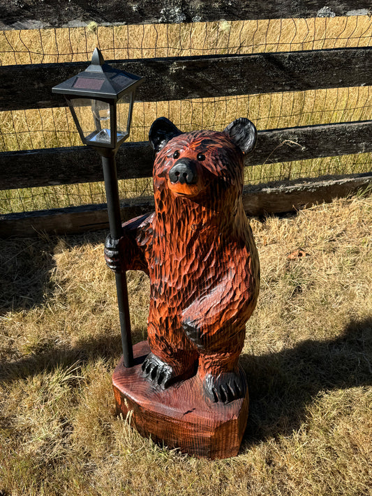 Chainsaw Carved Redwood Bear with Solar Lantern – 40”
