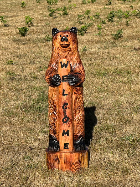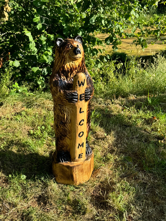 Chainsaw Carved Standing Bear with Welcome Sign - 36" Brown
