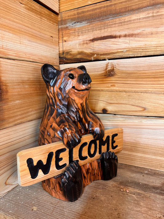 Wood Carved Bear Holding Welcome, Reversible Sign 11''- Customizable