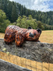 This is a small brown ledge bear carved from Giant Sequoia Redwood, made to lay on the edge of a shelf or mantel with its front paws hanging over. It measures about 10” long, 8” wide, and 6” tall. These look the best in elevated spots where the bear can lean over and “peek” down a bit.