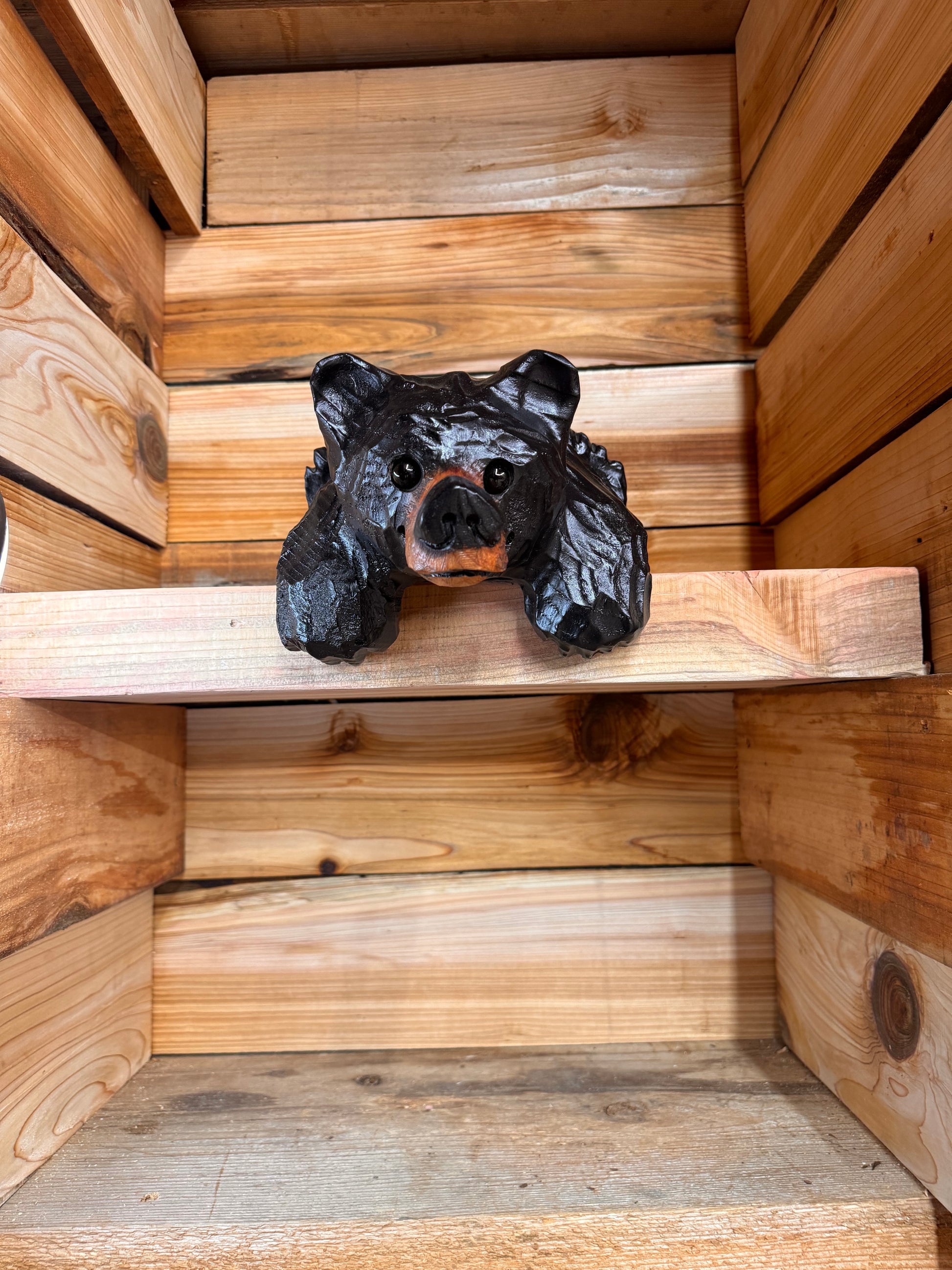 It’s carved from heart-free Western Red Cedar or Giant Sequoia Redwood reclaimed from tree work along the Oregon Coast. Using the outer part of the log helps avoid the deeper center cracks as it dries. The bear is painted black and sealed with spar urethane, so you can keep it indoors or outside.
