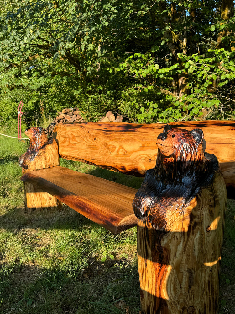 Hand Crafted Bench - Bears in Logs - Live Edge Slabs - Multiple Lengths - Brown