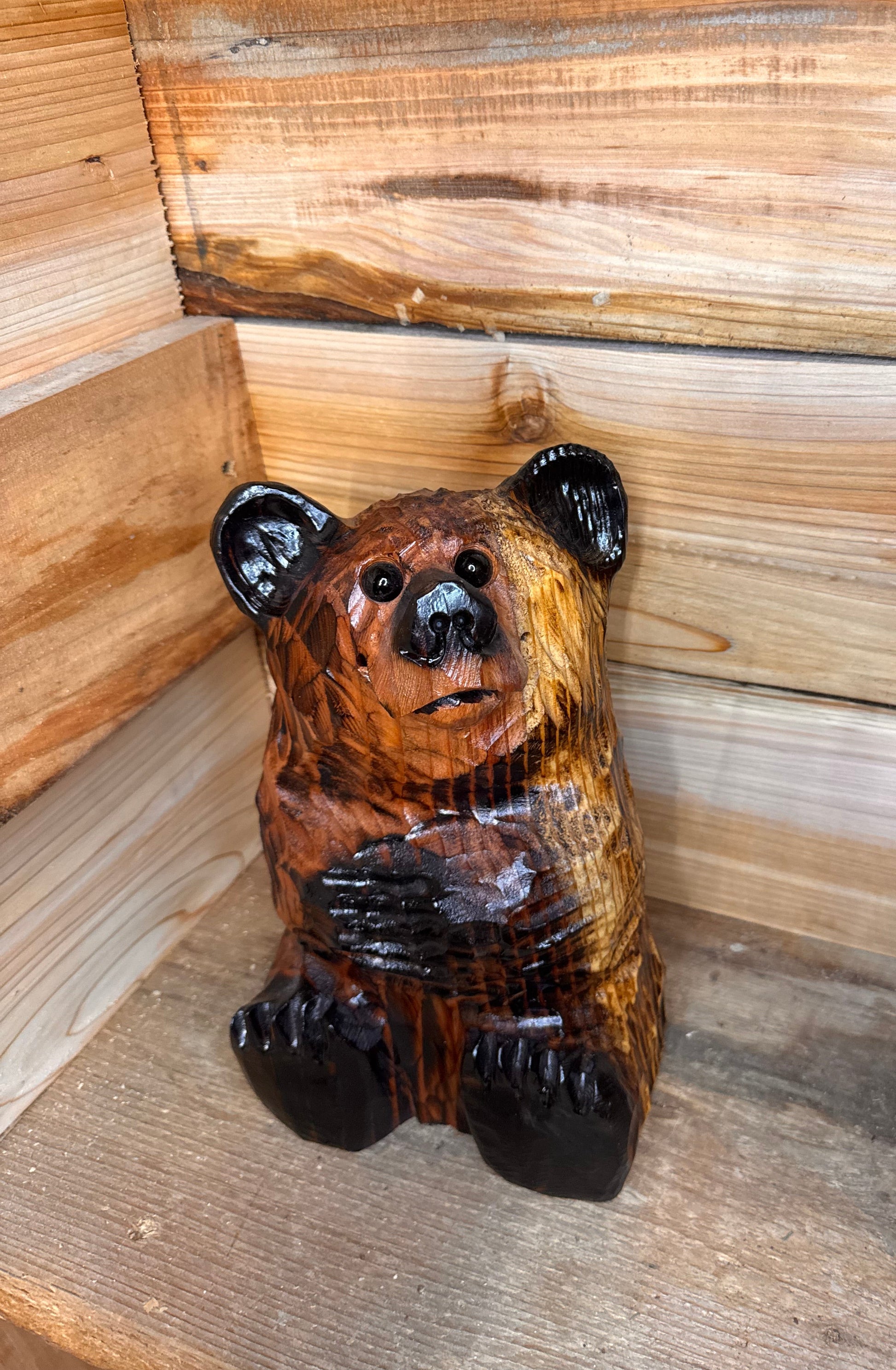 This 12" wood-carved sitting bear adds a playful and rustic vibe to any room, whether indoors or out. Hand-carved with a chainsaw from Giant Sequoia Redwood for superior durability, this charming bear is ready to make a statement in your home. Its dimensions of approximately 12" tall, 8" wide, and 6" deep make it a versatile addition to any style of decor. Finished with four coats of exterior spar urethane, it’s built to last.